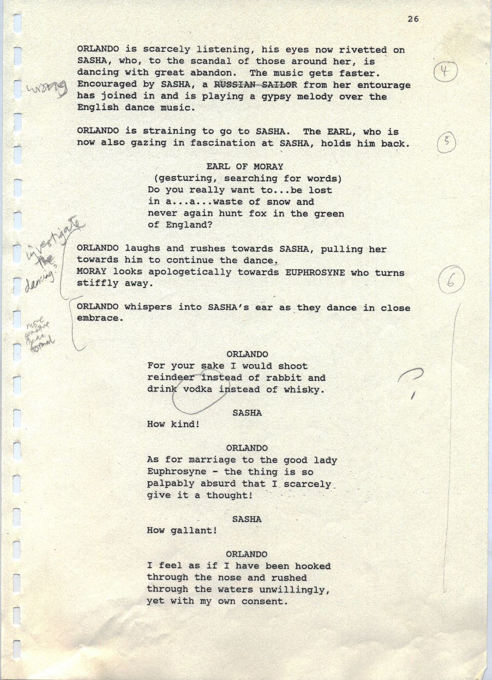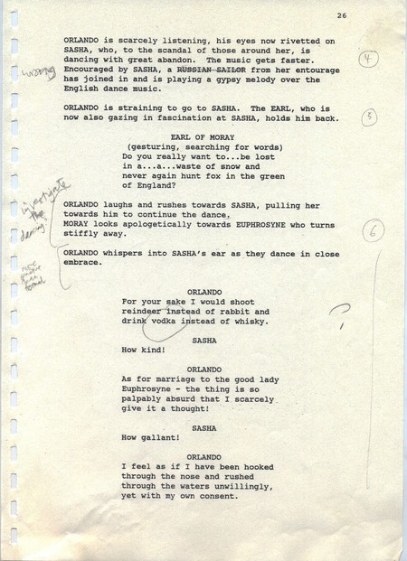 Description Revised draft script for Orlando, black printed text on white A4 paper with annotations in pencil, page 26, front
