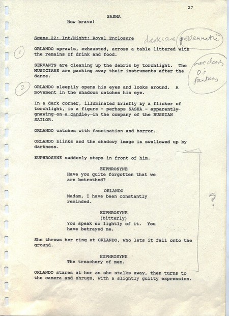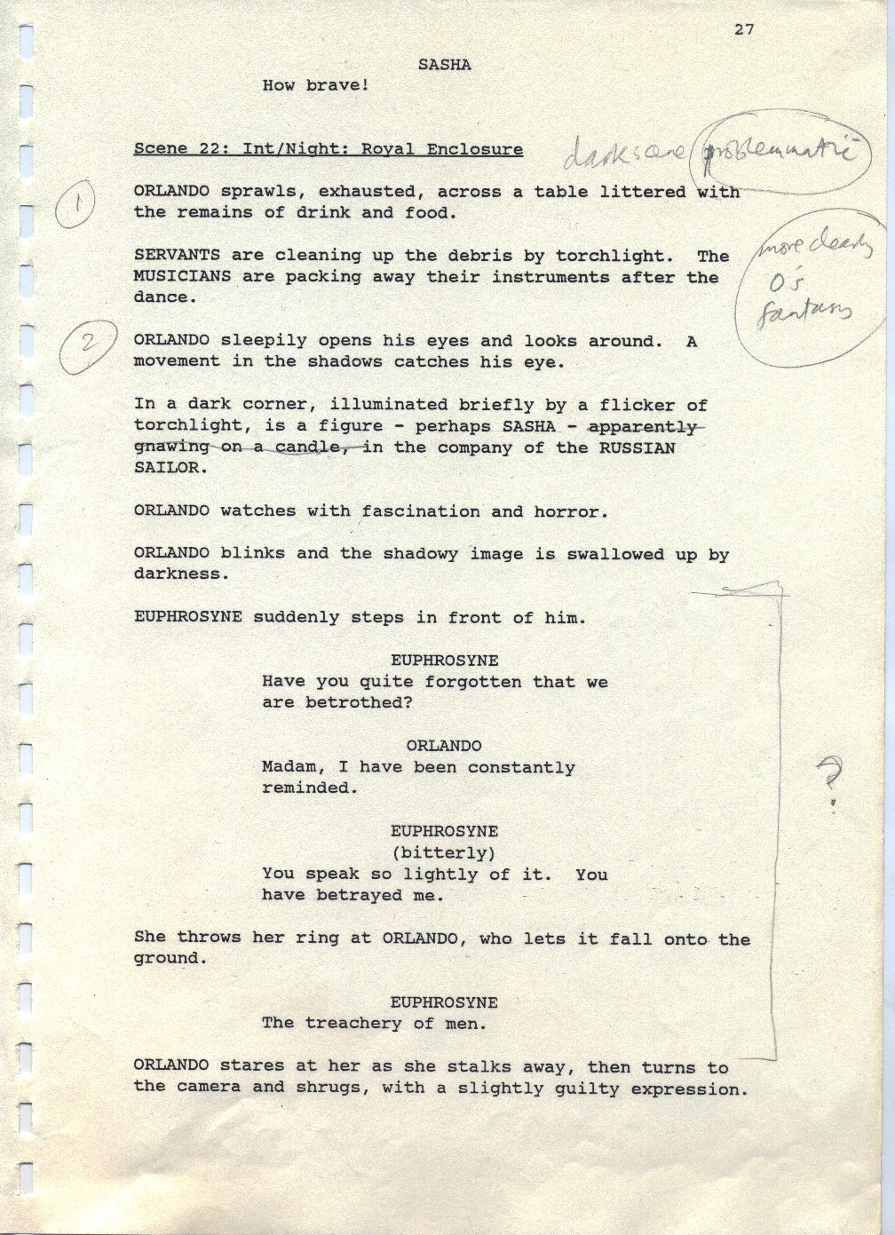 Description Revised draft script for Orlando, black printed text on white A4 paper with annotations in pencil, page 27, front