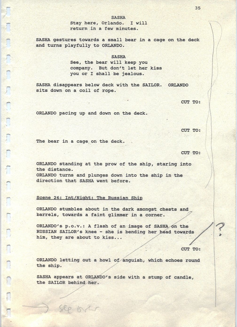 Description Revised draft script for Orlando, black printed text on white A4 paper with annotations in pencil, page 35, front