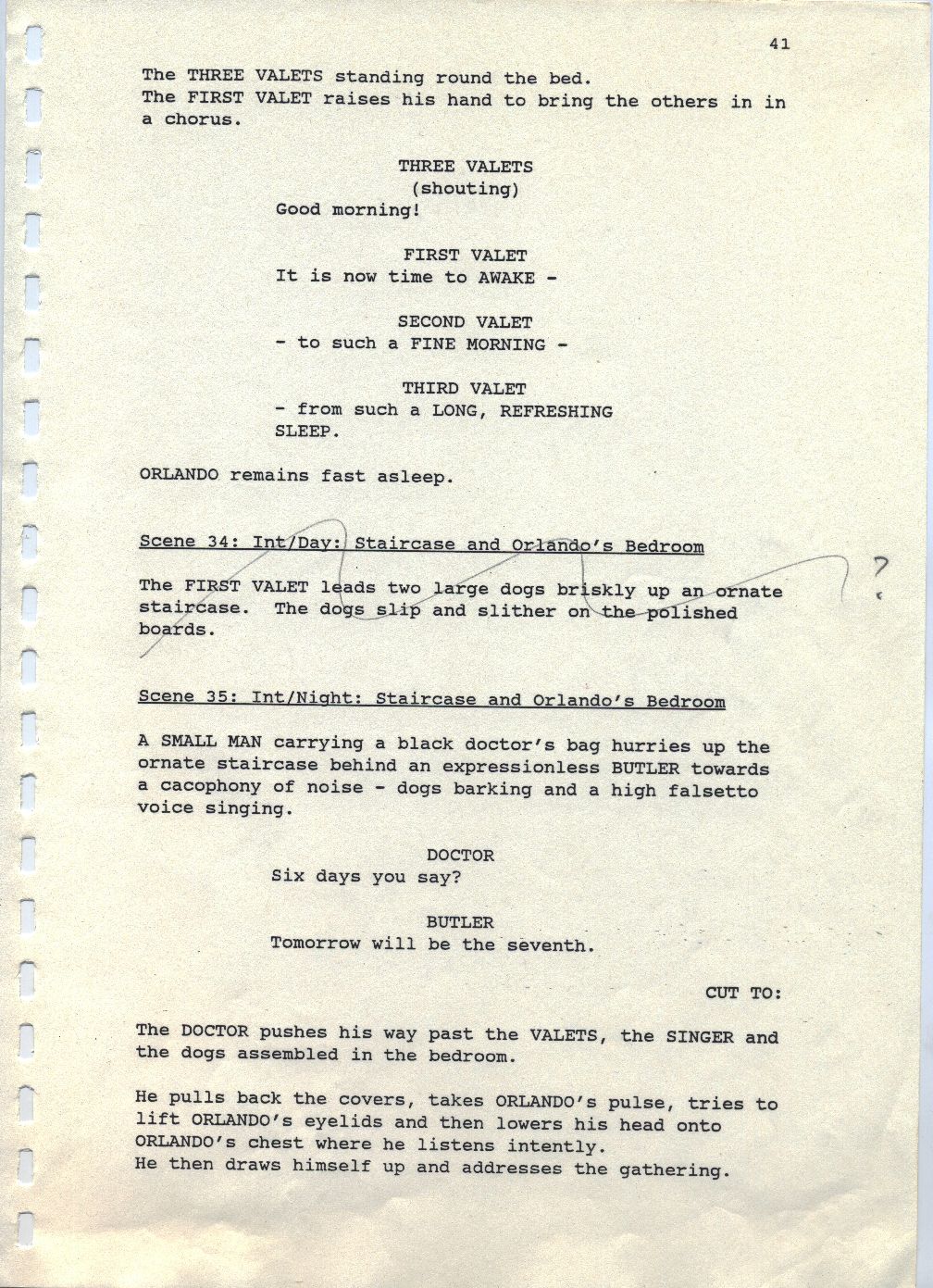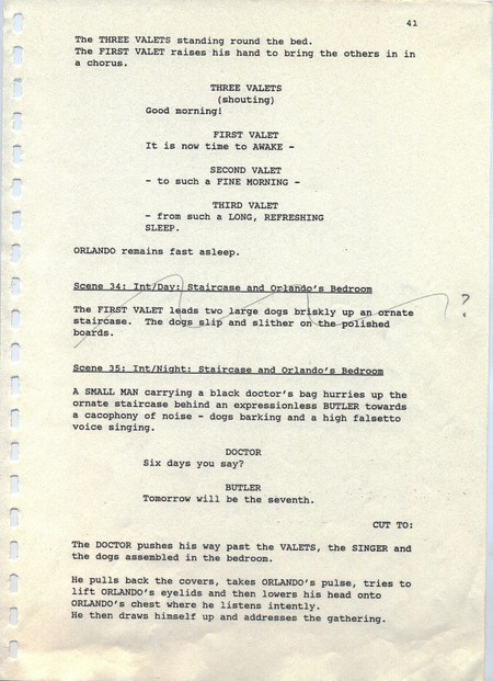 Description Revised draft script for Orlando, black printed text on white A4 paper with annotations in pencil, page 41, front