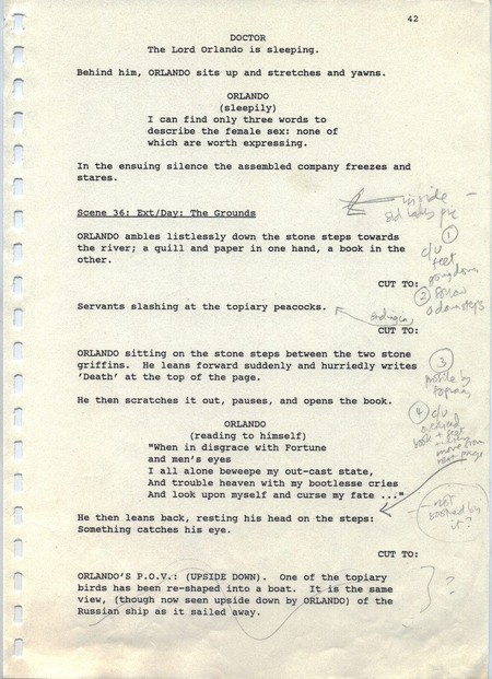 Description Revised draft script for Orlando, black printed text on white A4 paper with annotations in pencil, page 42, front