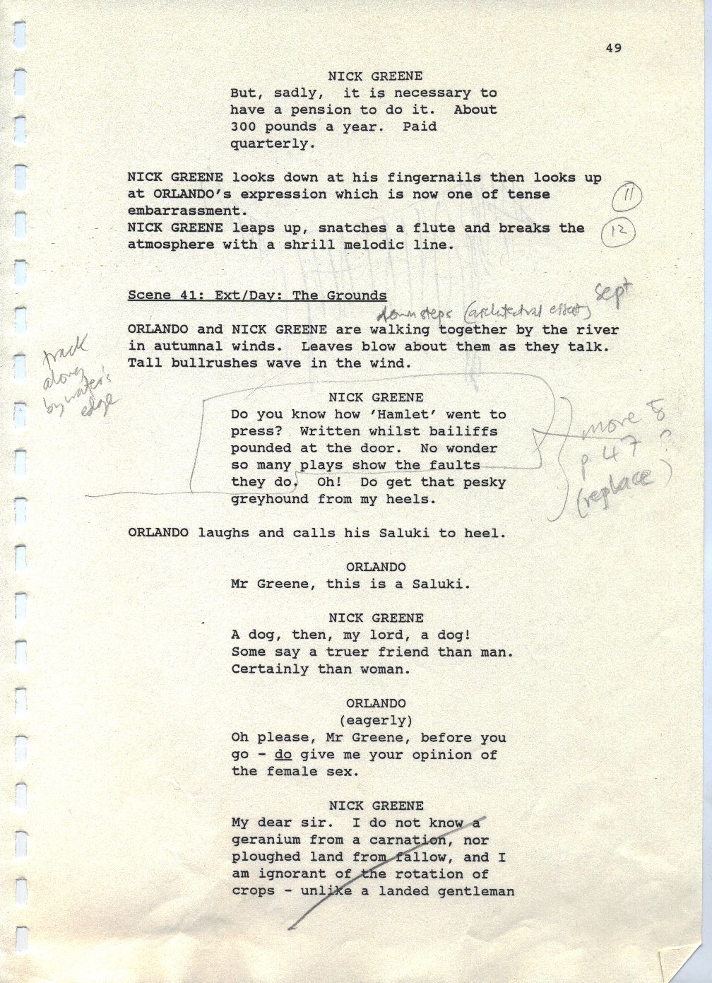 Description Revised draft script for Orlando, black printed text on white A4 paper with annotations in pencil, page 49, front