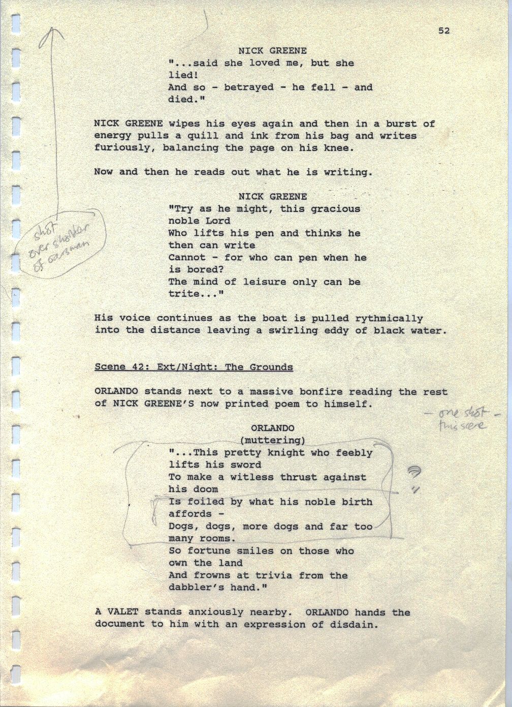 Description Revised draft script for Orlando, black printed text on white A4 paper with annotations in pencil, page 52, front