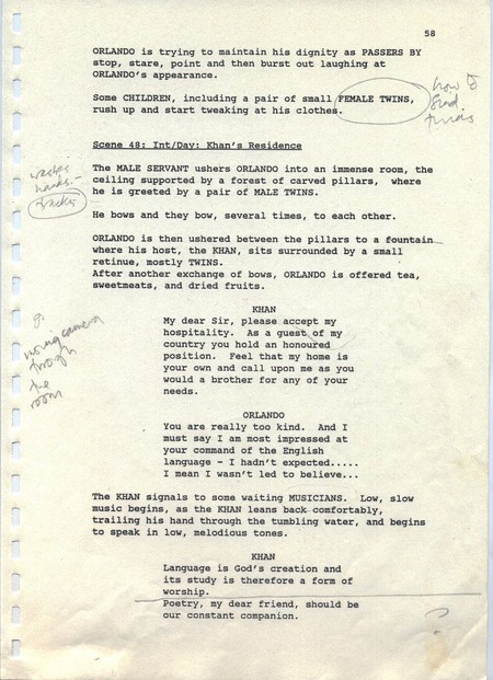 Description Revised draft script for Orlando, black printed text on white A4 paper with annotations in pencil, page 58, front