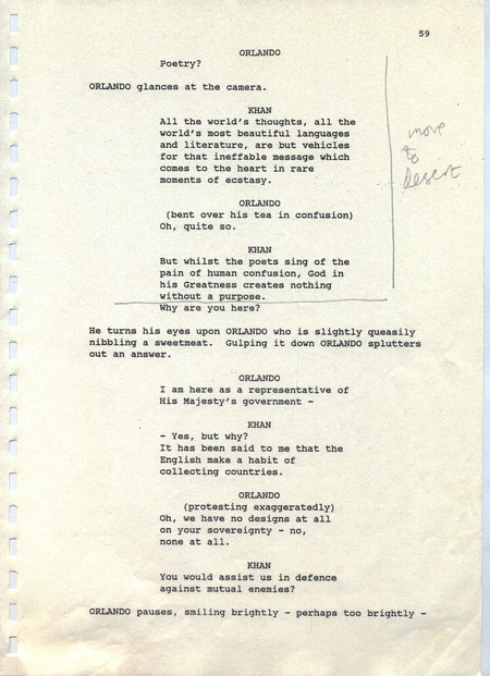 Description Revised draft script for Orlando, black printed text on white A4 paper with annotations in pencil, page 59, front