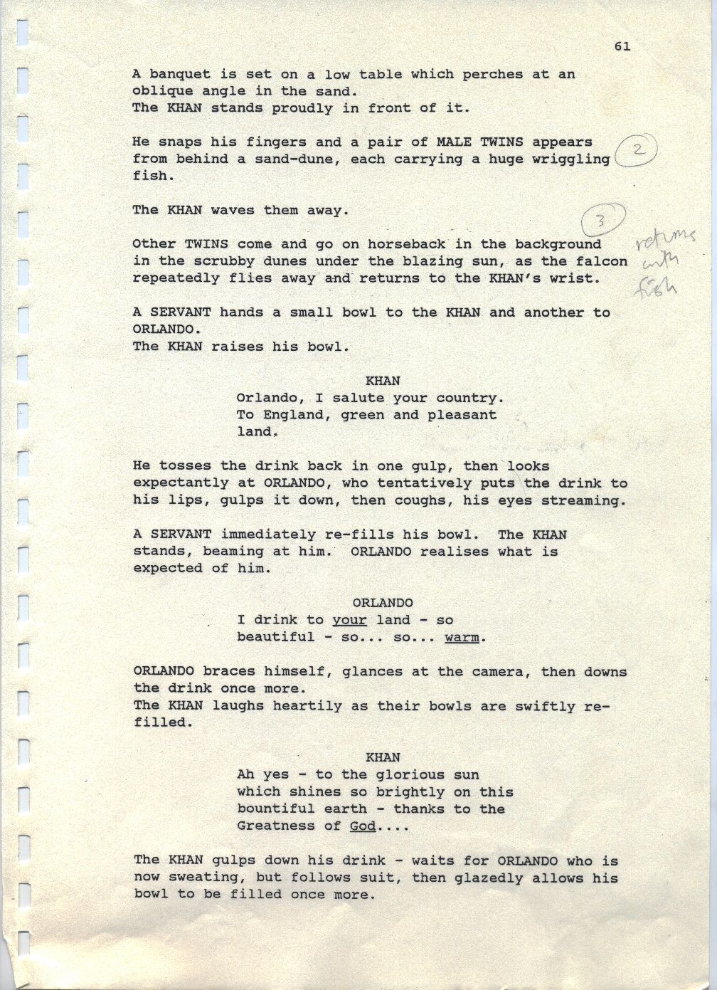Description Revised draft script for Orlando, black printed text on white A4 paper with annotations in pencil, page 61 front