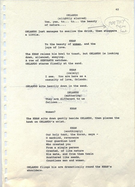 Description Revised draft script for Orlando, black printed text on white A4 paper with annotations in pencil, page 62 front