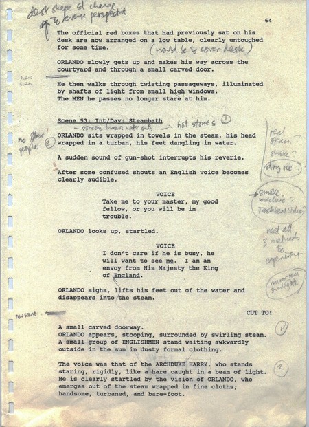 Description Revised draft script for Orlando, black printed text on white A4 paper with annotations in pencil, page 64 front