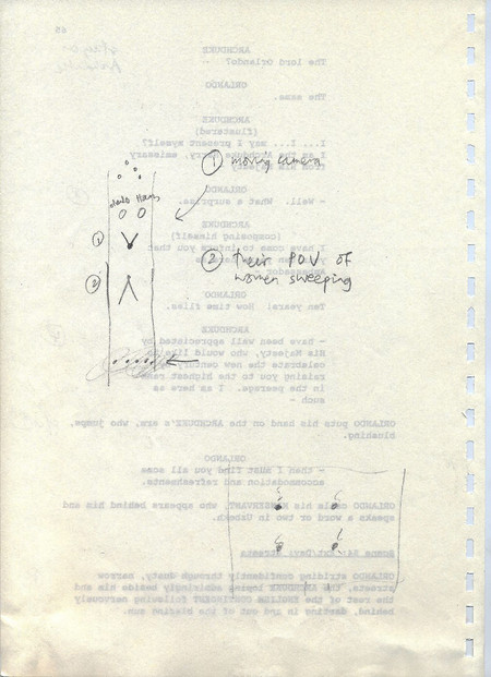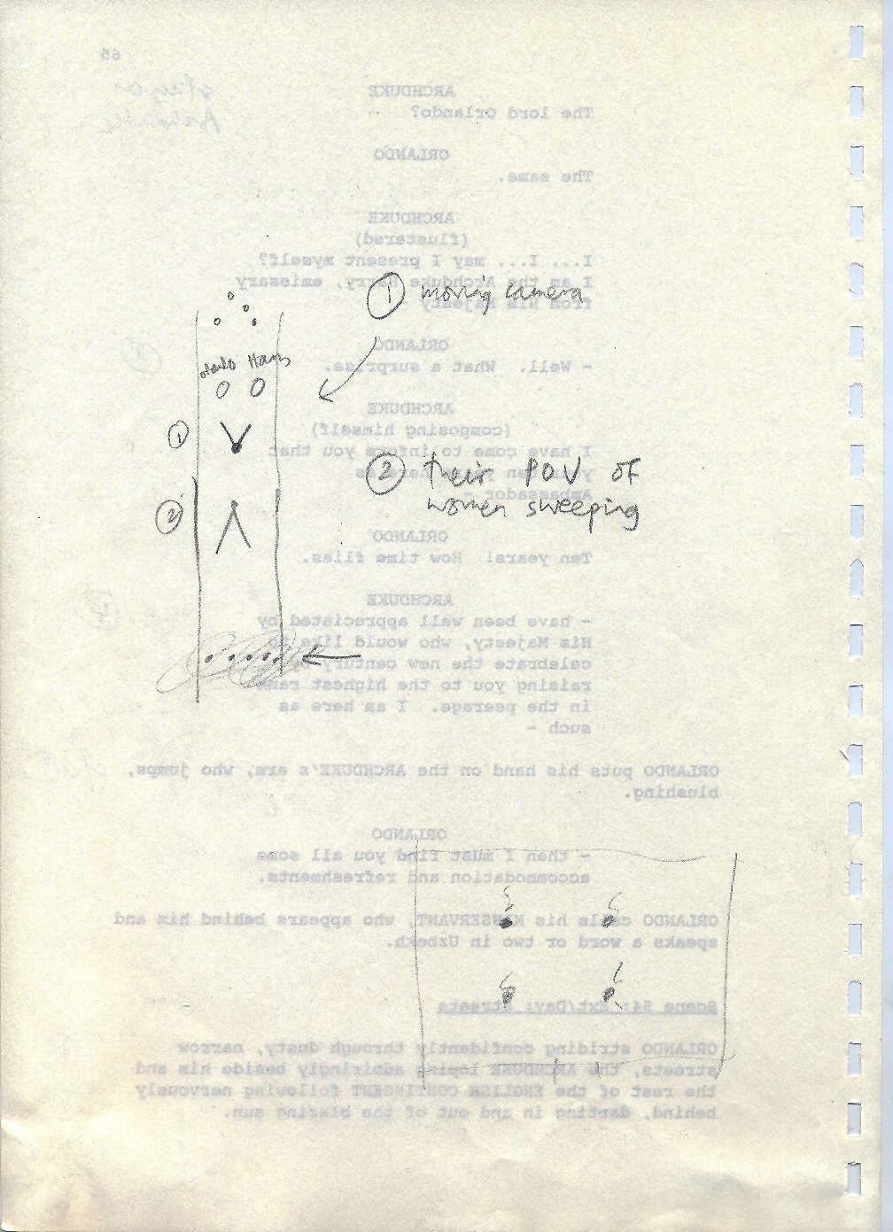 Description Revised draft script for Orlando, handwritten notes and diagrams in pencil, page 65, back