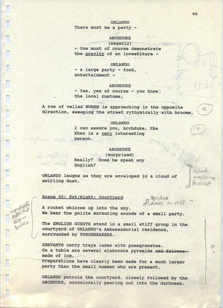 Description Revised draft script for Orlando, black printed text on white A4 paper with annotations in pencil, page 66 front