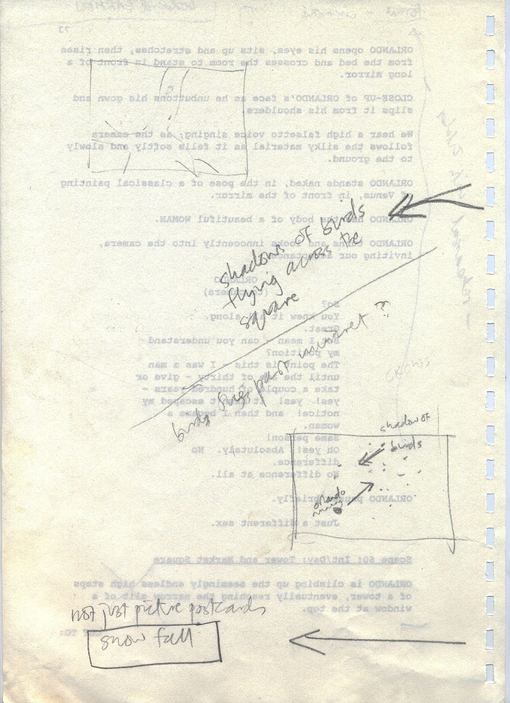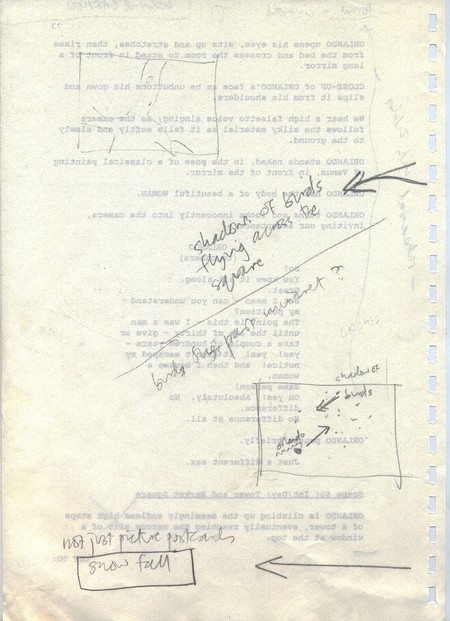 Description Revised draft script for Orlando, handwritten notes and diagrams in pencil, page 73, back