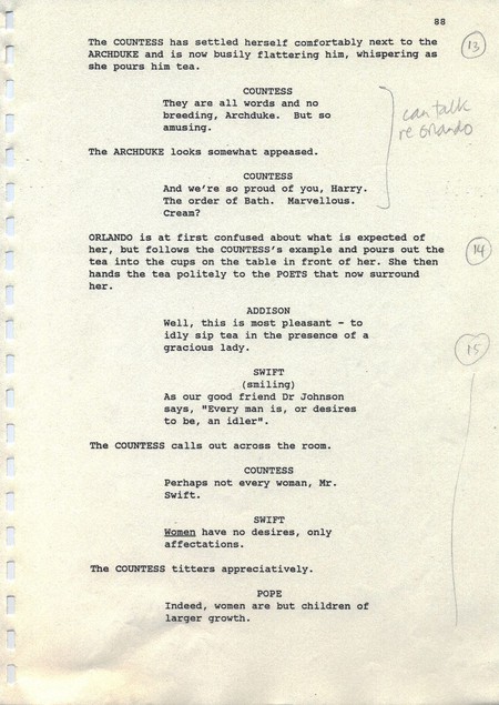Description Revised draft script for Orlando, black printed text on white A4 paper with annotations in pencil, page 88, front