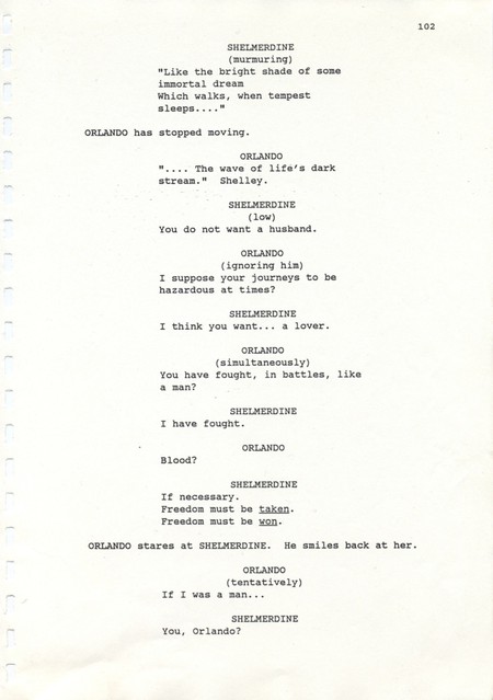 Description Revised draft script for Orlando, black printed text on white A4 paper with annotations in pencil, page 102, front