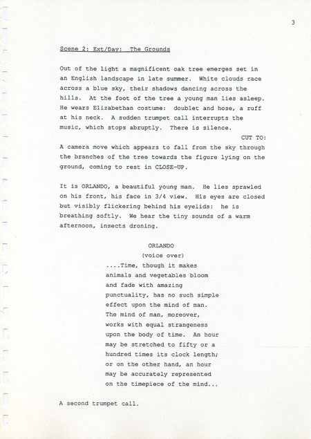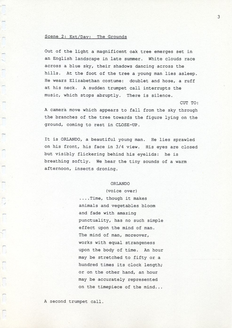 Description Page 3 of revised draft script for Orlando. Black printed text on A4 paper bound with a plastic comb spine
