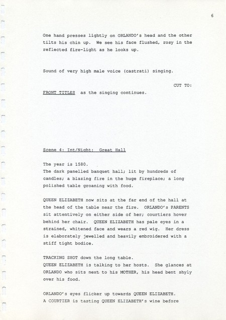 Description Page 6 of revised draft script for Orlando. Black printed text on A4 paper bound with a plastic comb spine