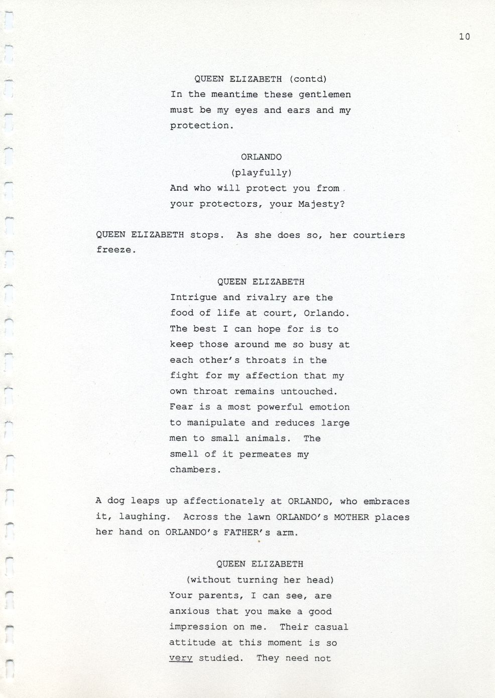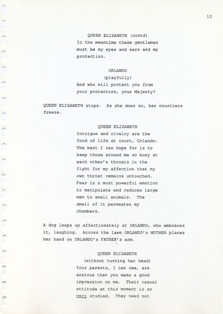 Description Page 10 of revised draft script for Orlando. Black printed text on A4 paper bound with a plastic comb spine
