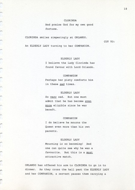 Description Page 18 of revised draft script for Orlando. Black printed text on A4 paper bound with a plastic comb spine