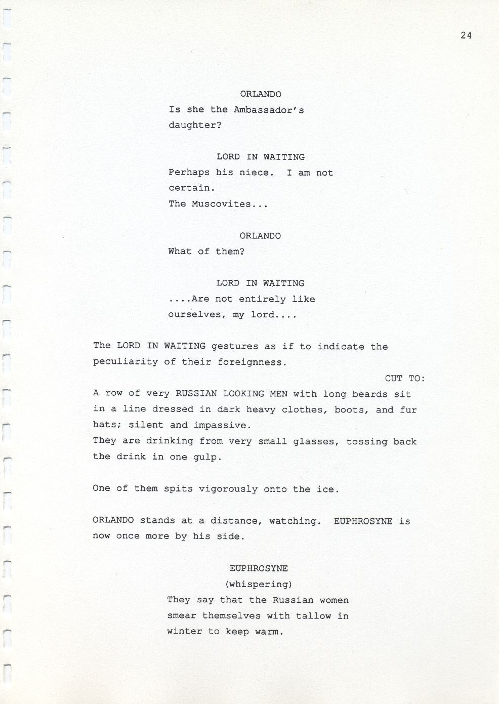 Description Page 24 of revised draft script for Orlando. Black printed text on A4 paper bound with a plastic comb spine