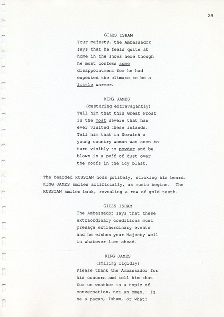 Description Page 29 of revised draft script for Orlando. Black printed text on A4 paper bound with a plastic comb spine