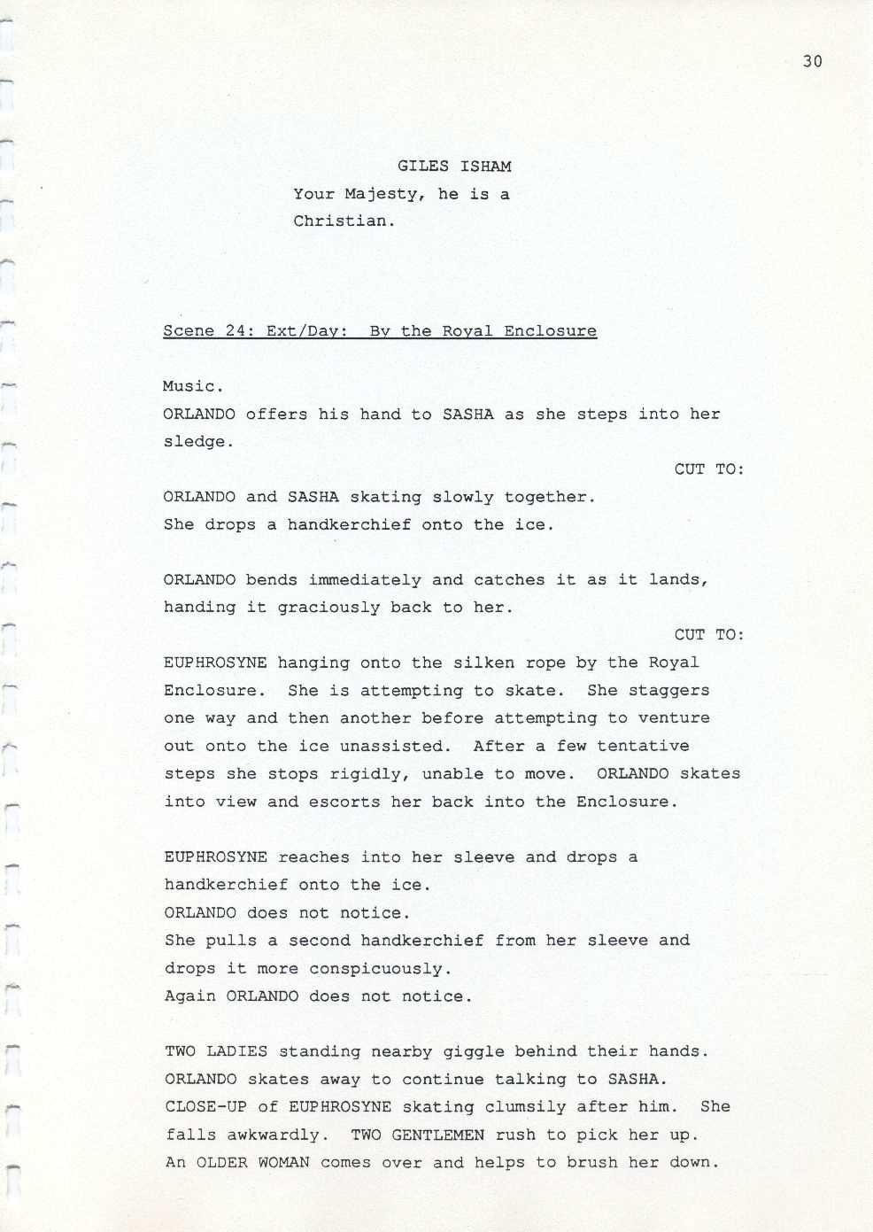 Description Page 30 of revised draft script for Orlando. Black printed text on A4 paper bound with a plastic comb spine