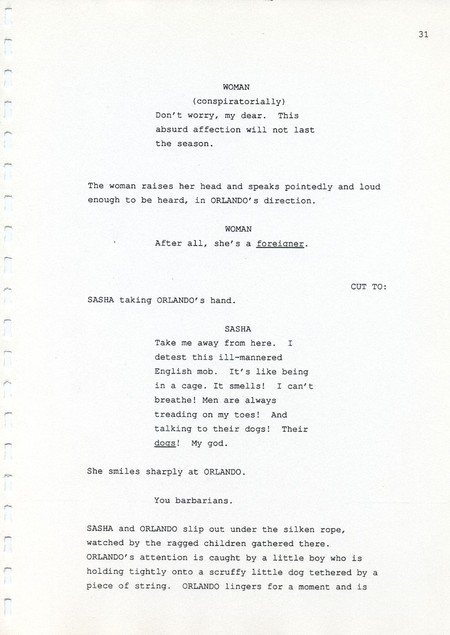 Description Page 31 of revised draft script for Orlando. Black printed text on A4 paper bound with a plastic comb spine