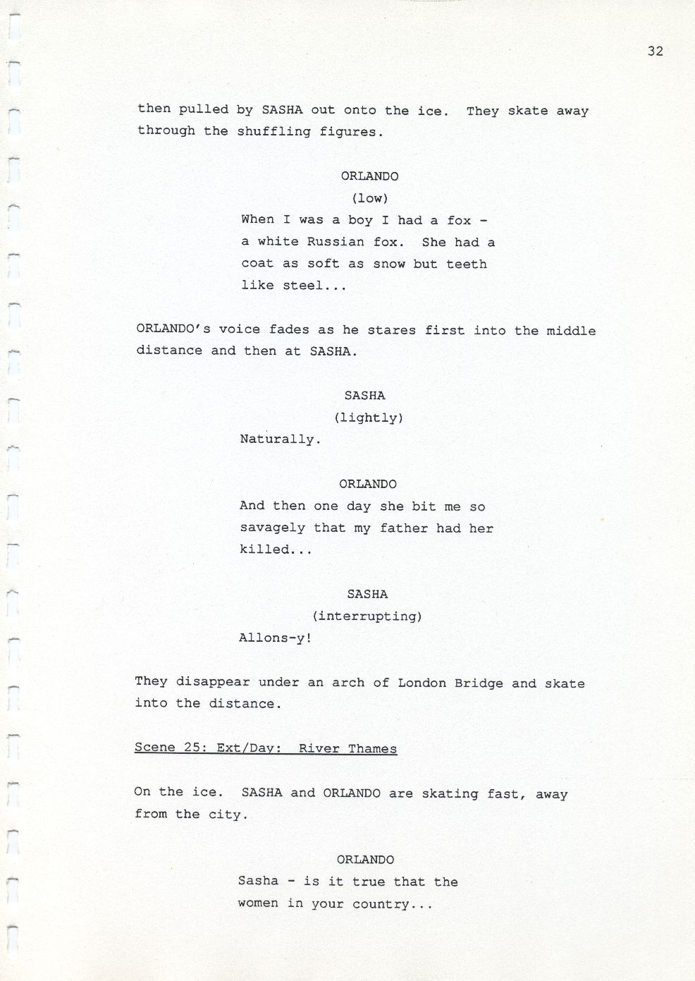 Description Page 32 of revised draft script for Orlando. Black printed text on A4 paper bound with a plastic comb spine