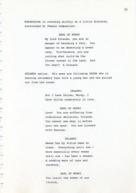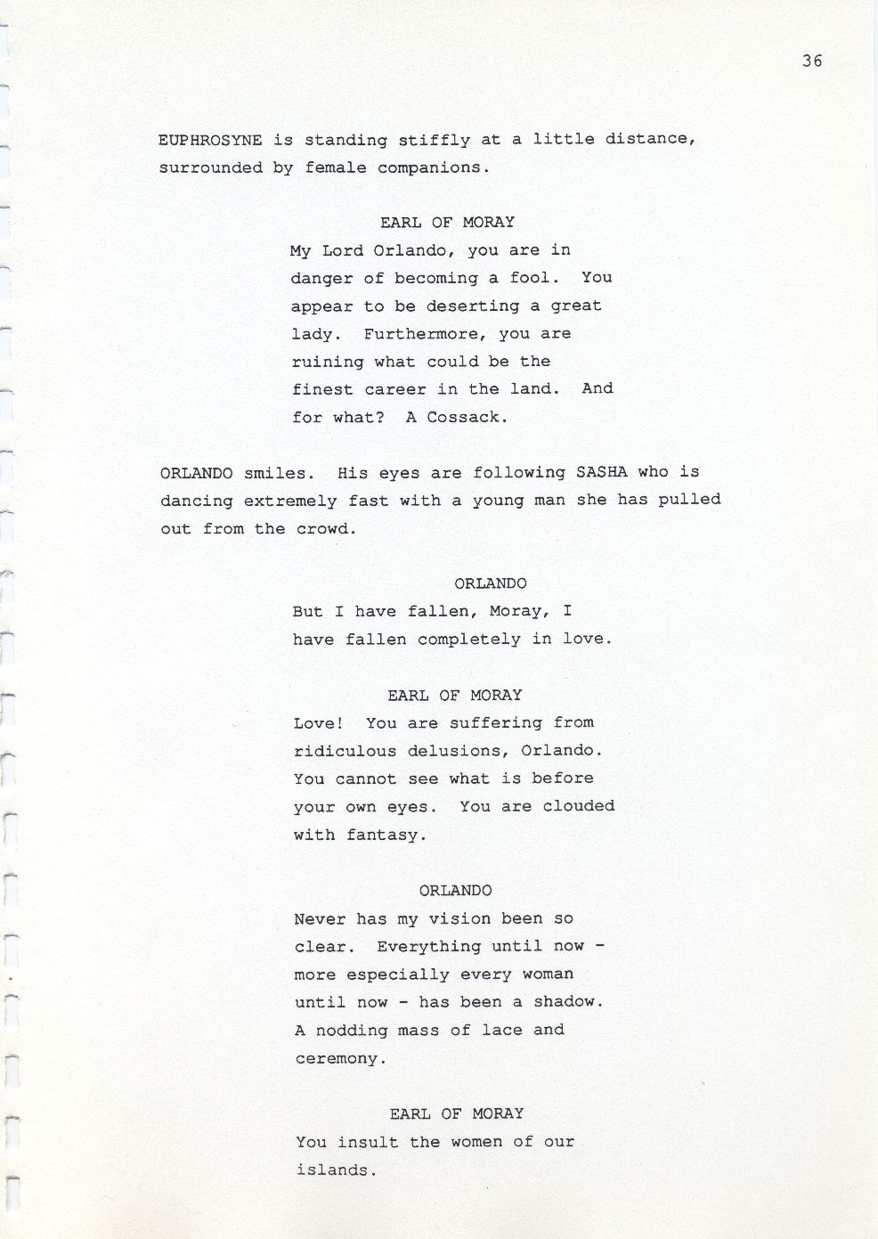Description Page 36 of revised draft script for Orlando. Black printed text on A4 paper bound with a plastic comb spine