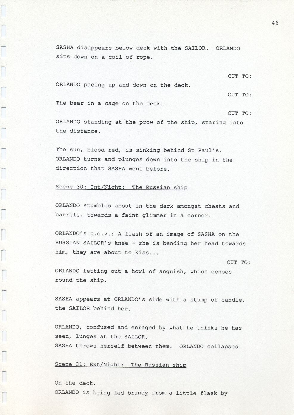 Description Page 46 of revised draft script for Orlando. Black printed text on A4 paper bound with a plastic comb spine