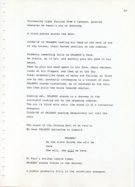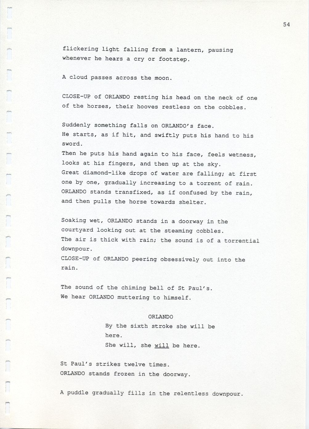 Description Page 54 of revised draft script for Orlando. Black printed text on A4 paper bound with a plastic comb spine