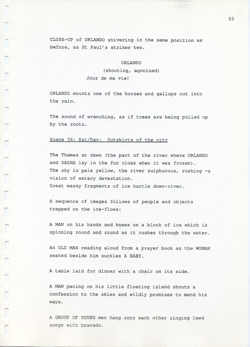 Description Page 55 of revised draft script for Orlando. Black printed text on A4 paper bound with a plastic comb spine