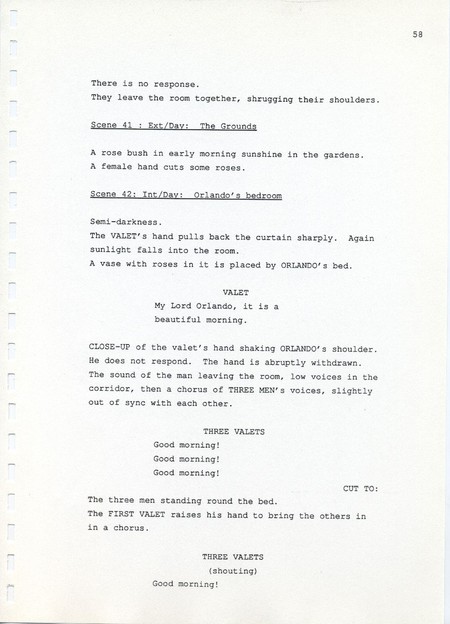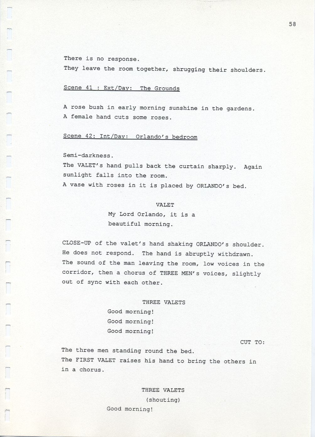 Description Page 58 of revised draft script for Orlando. Black printed text on A4 paper bound with a plastic comb spine