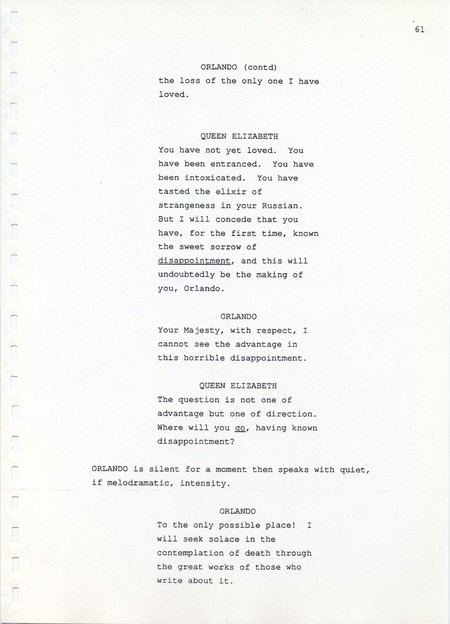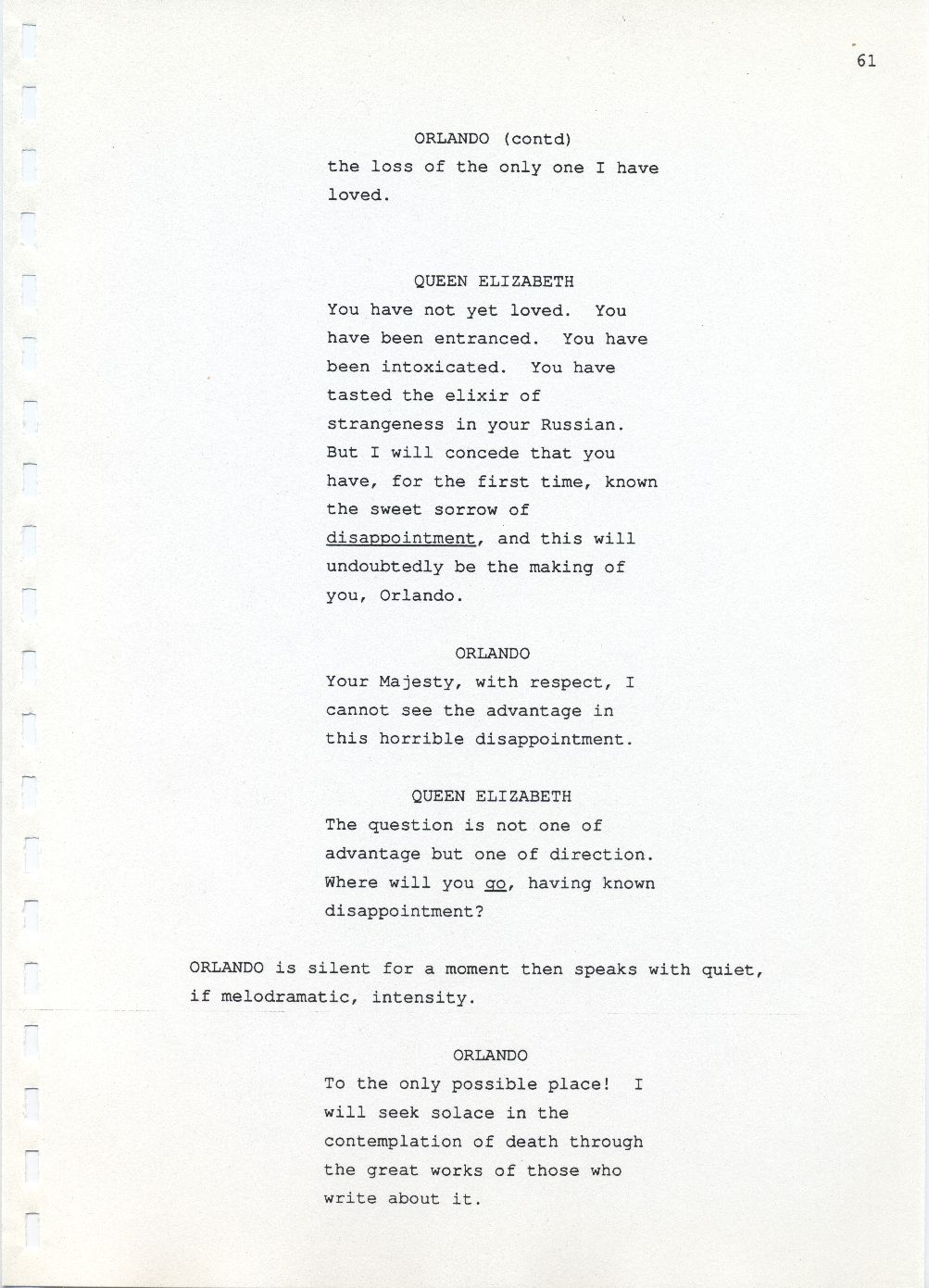 Description Page 61 of revised draft script for Orlando. Black printed text on A4 paper bound with a plastic comb spine