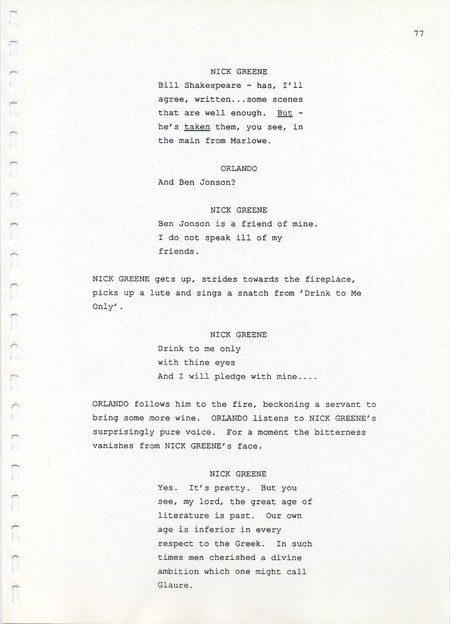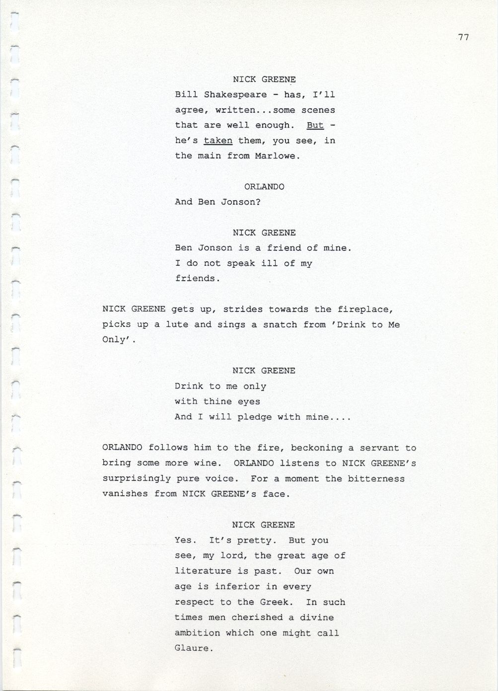 Description Page 77 of revised draft script for Orlando. Black printed text on A4 paper bound with a plastic comb spine