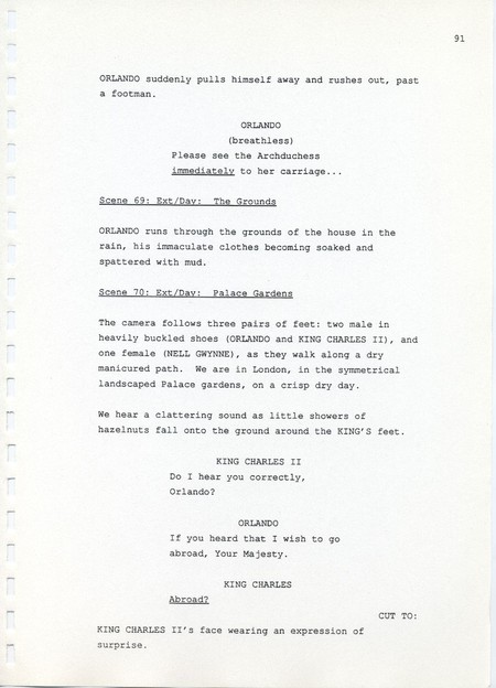 Description Page 91 of revised draft script for Orlando. Black printed text on A4 paper bound with a plastic comb spine