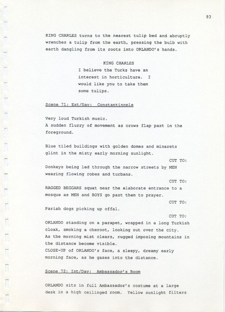 Description Page 93 of revised draft script for Orlando. Black printed text on A4 paper bound with a plastic comb spine