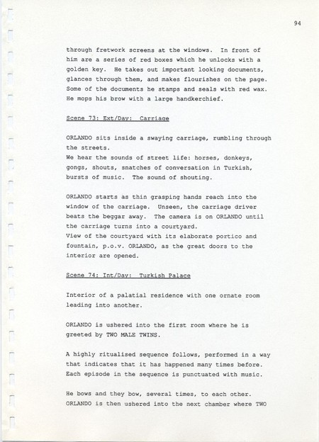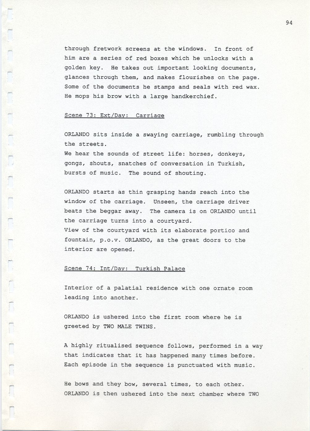 Description Page 94 of revised draft script for Orlando. Black printed text on A4 paper bound with a plastic comb spine