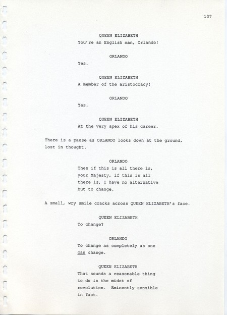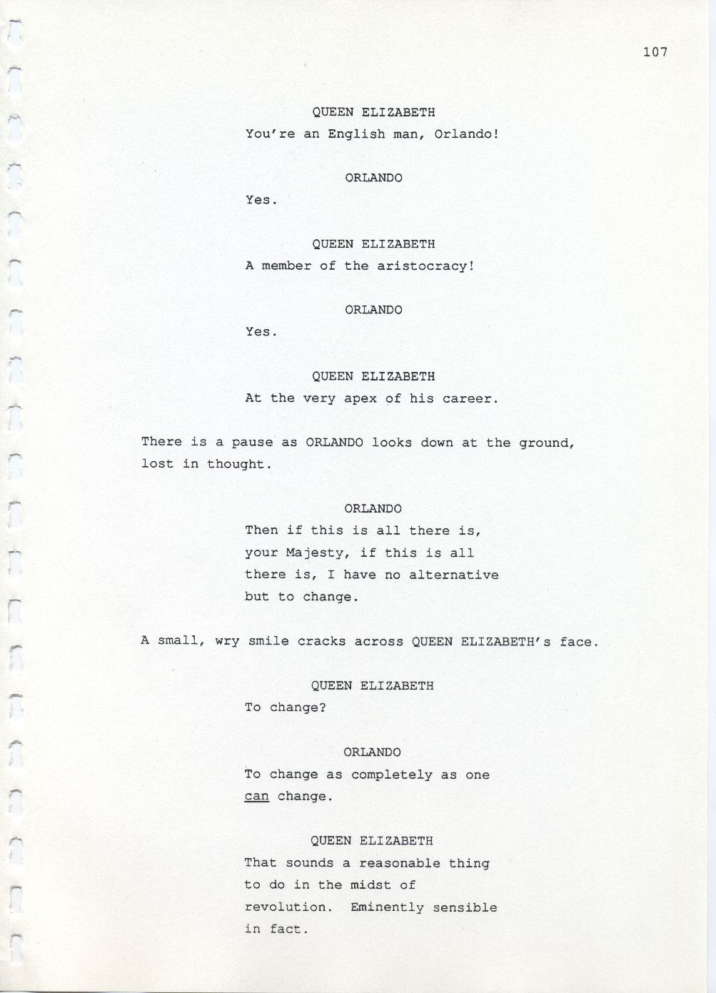 Description Page 107 of revised draft script for Orlando. Black printed text on A4 paper bound with a plastic comb spine