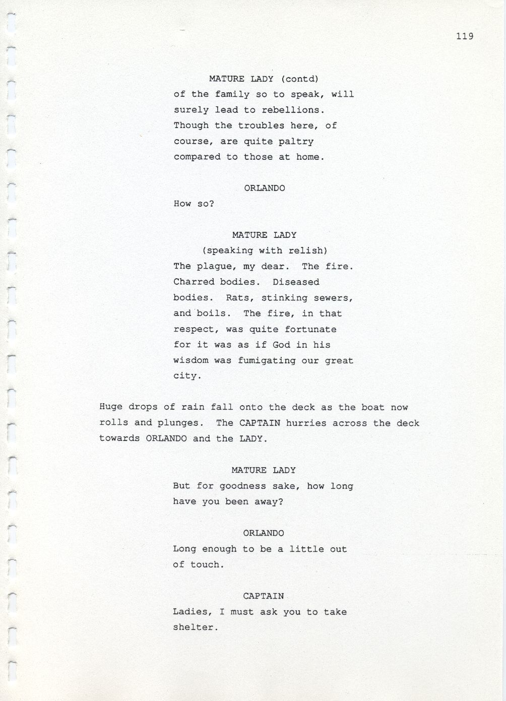 Description Page 119 of revised draft script for Orlando. Black printed text on A4 paper bound with a plastic comb spine