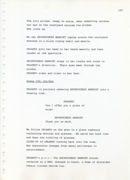 Description Page 124 of revised draft script for Orlando. Black printed text on A4 paper bound with a plastic comb spine