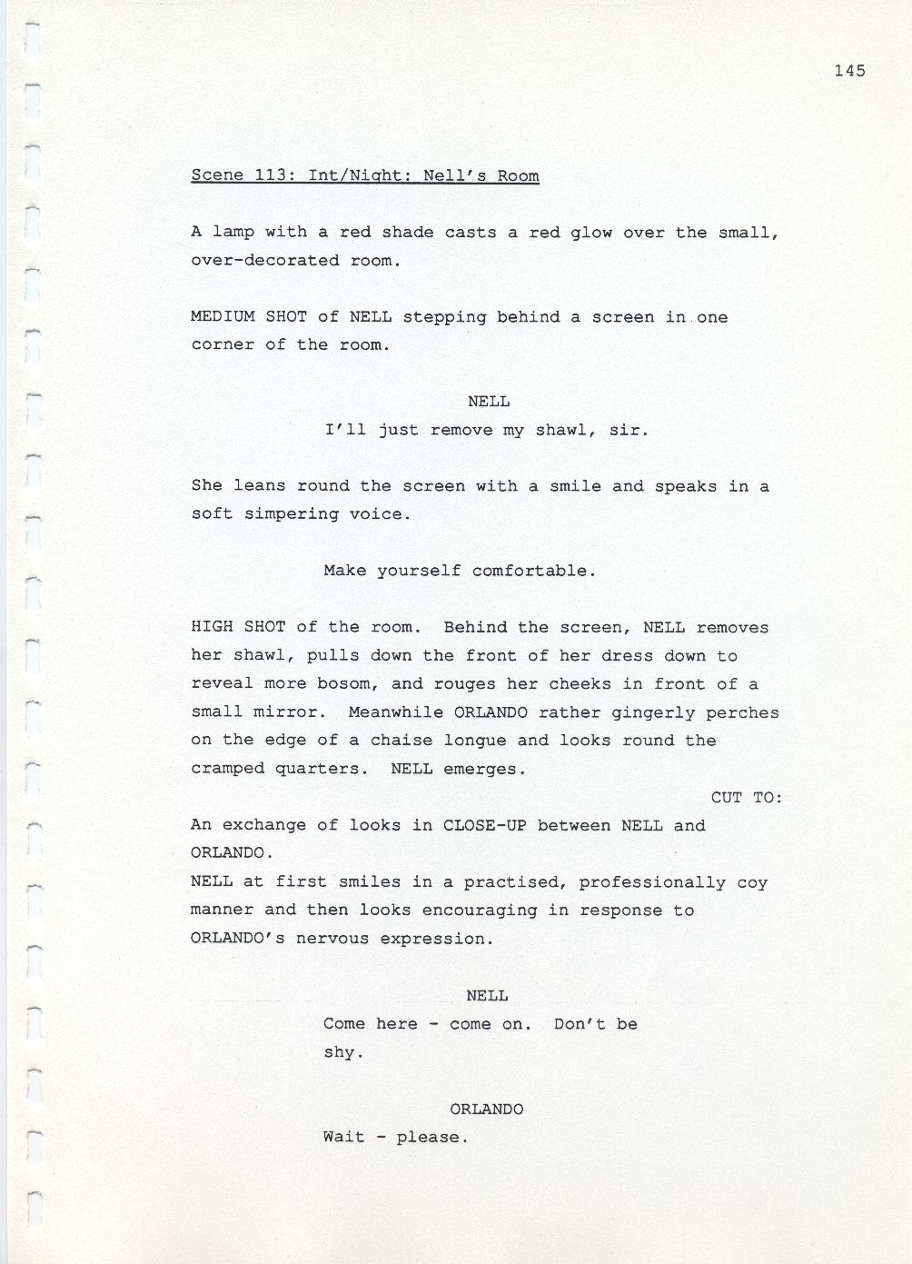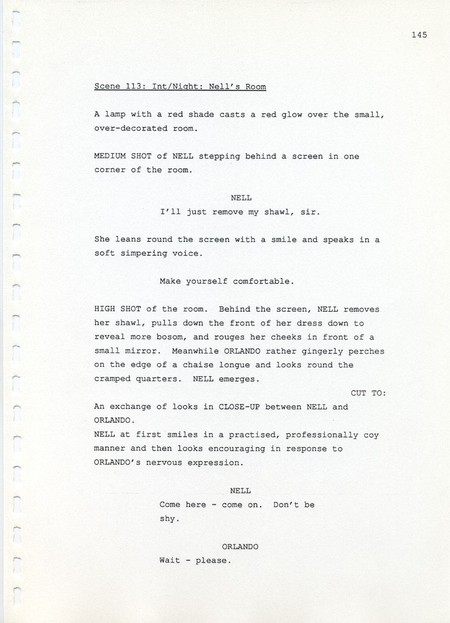 Description Page 145 of revised draft script for Orlando. Black printed text on A4 paper bound with a plastic comb spine