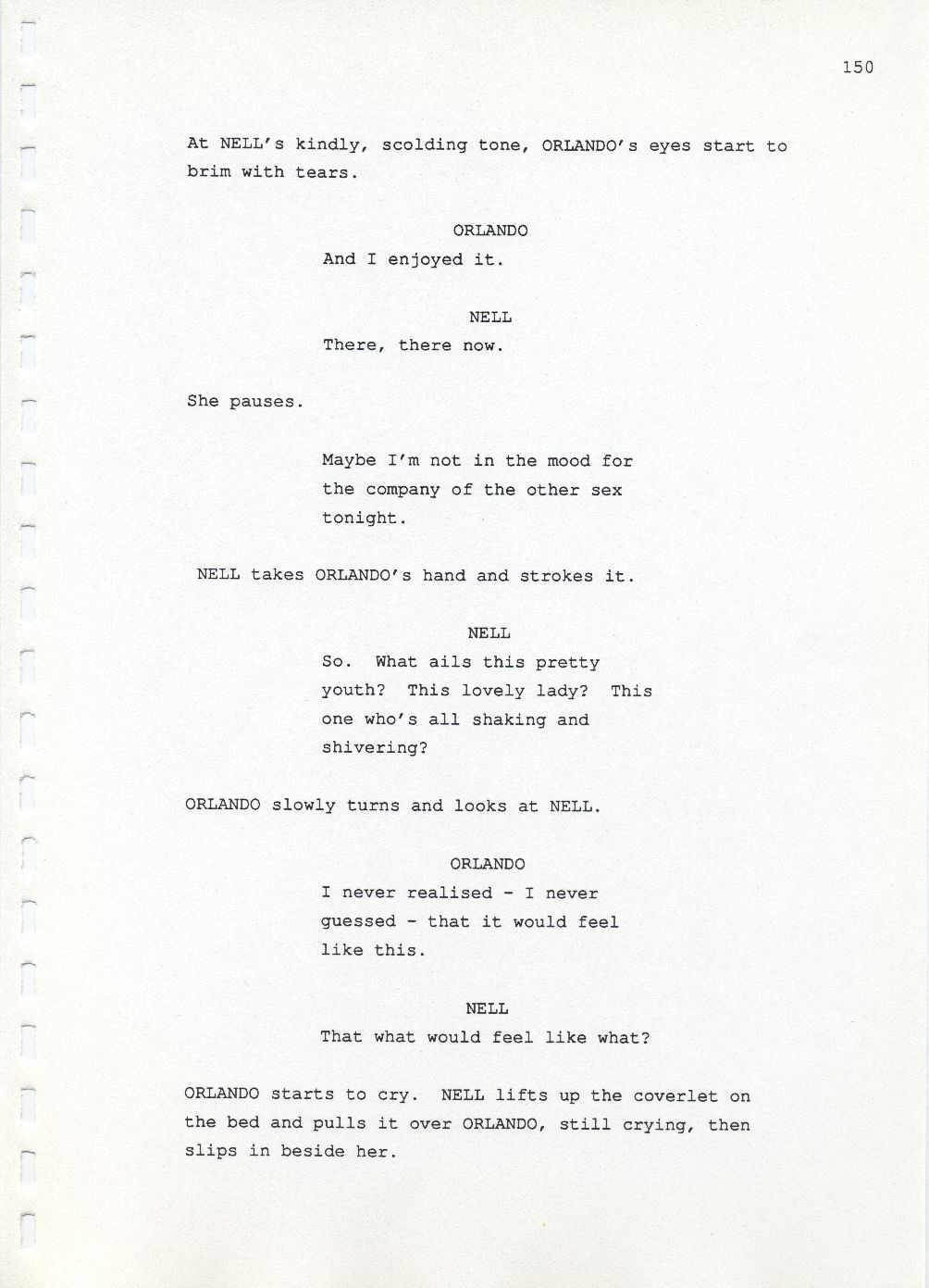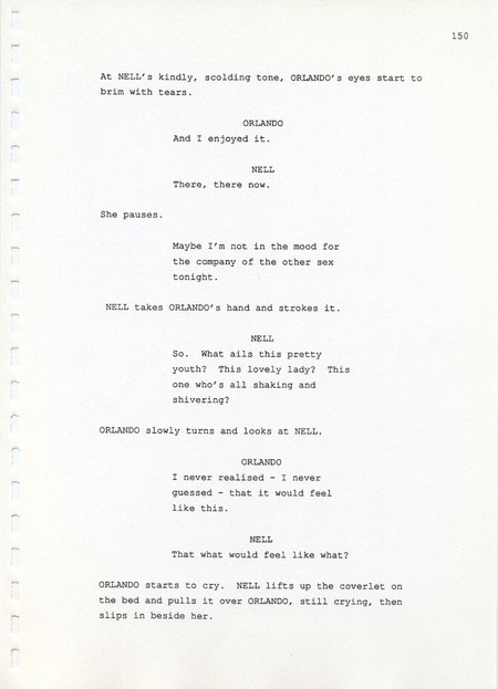 Description Page 150 of revised draft script for Orlando. Black printed text on A4 paper bound with a plastic comb spine