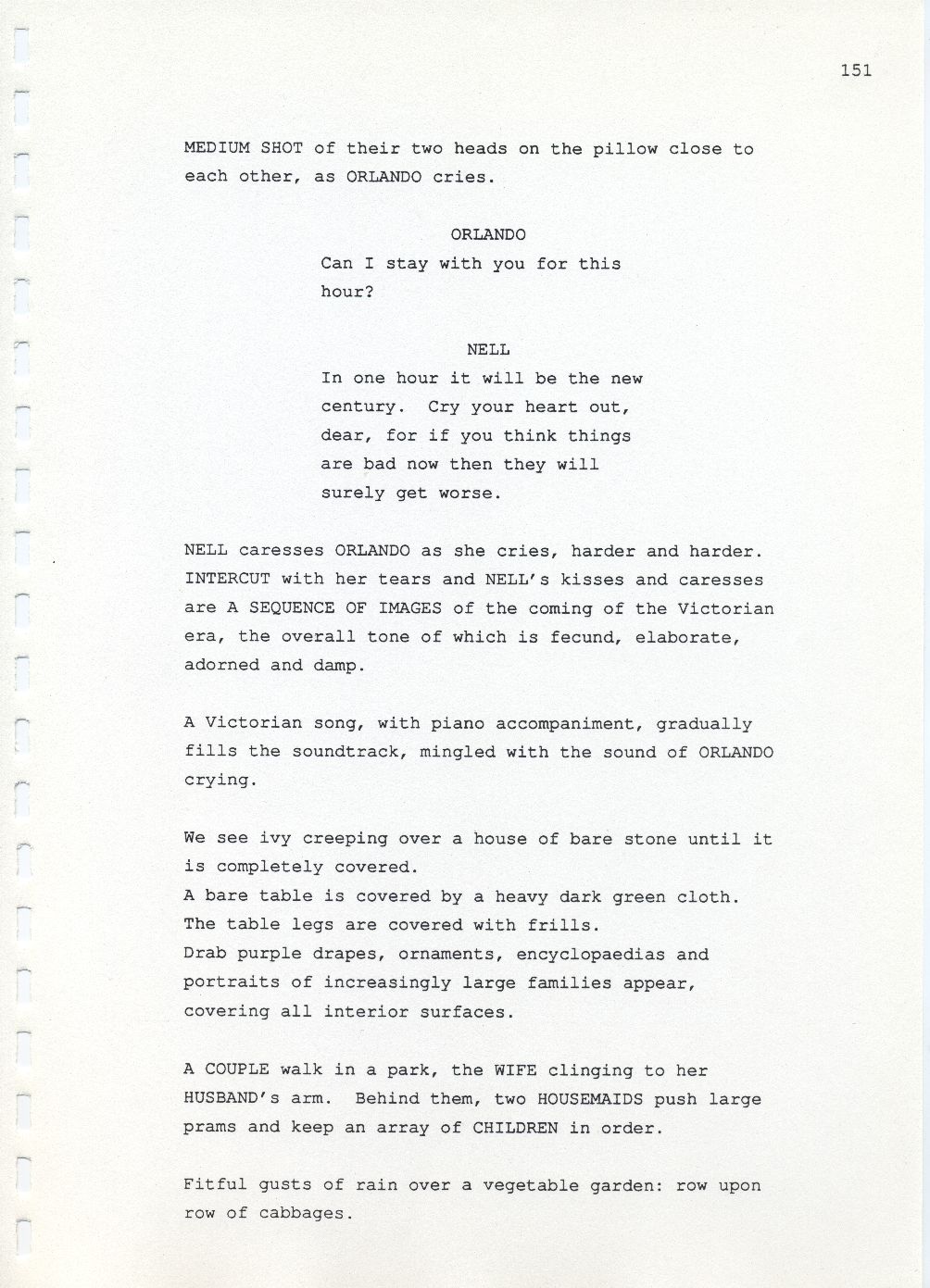 Description Page 151 of revised draft script for Orlando. Black printed text on A4 paper bound with a plastic comb spine