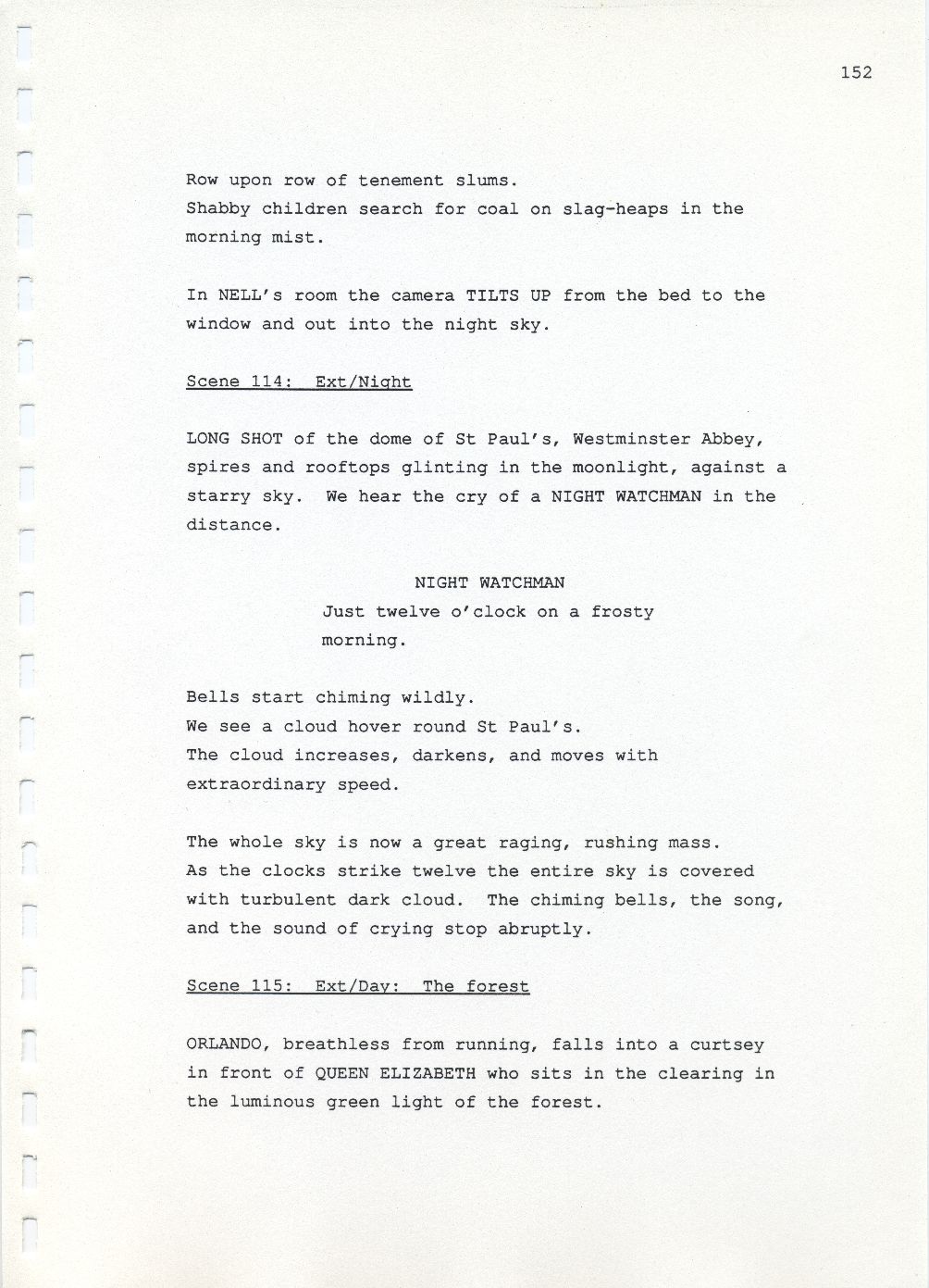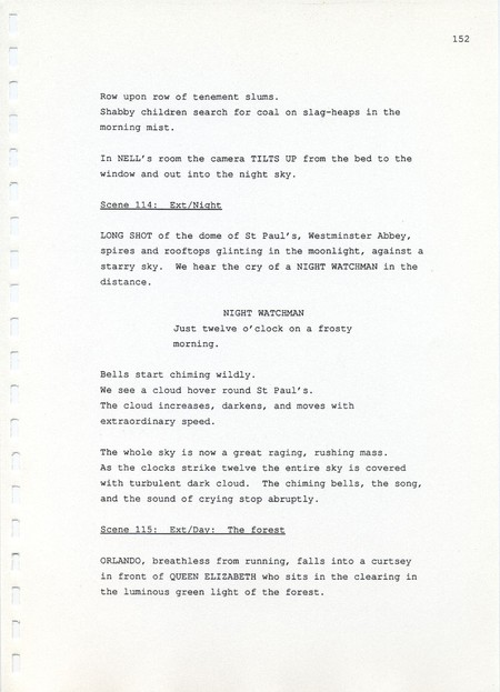 Description Page 152 of revised draft script for Orlando. Black printed text on A4 paper bound with a plastic comb spine