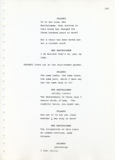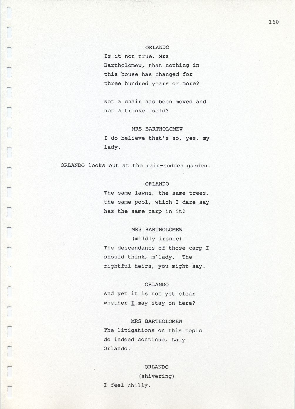 Description Page 160 of revised draft script for Orlando. Black printed text on A4 paper bound with a plastic comb spine