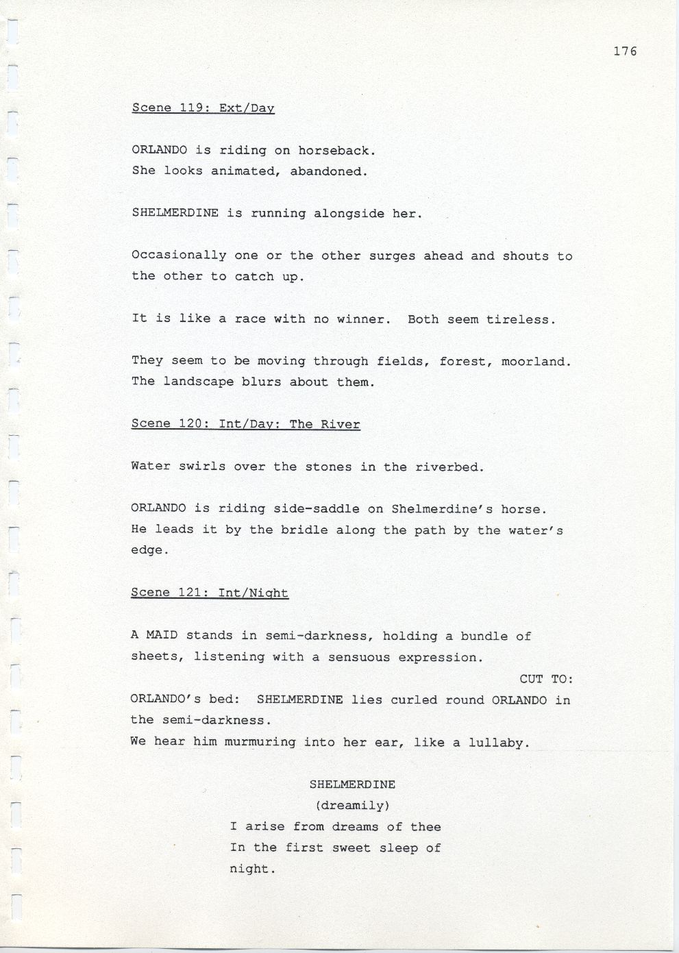 Description Page 176 of revised draft script for Orlando. Black printed text on A4 paper bound with a plastic comb spine