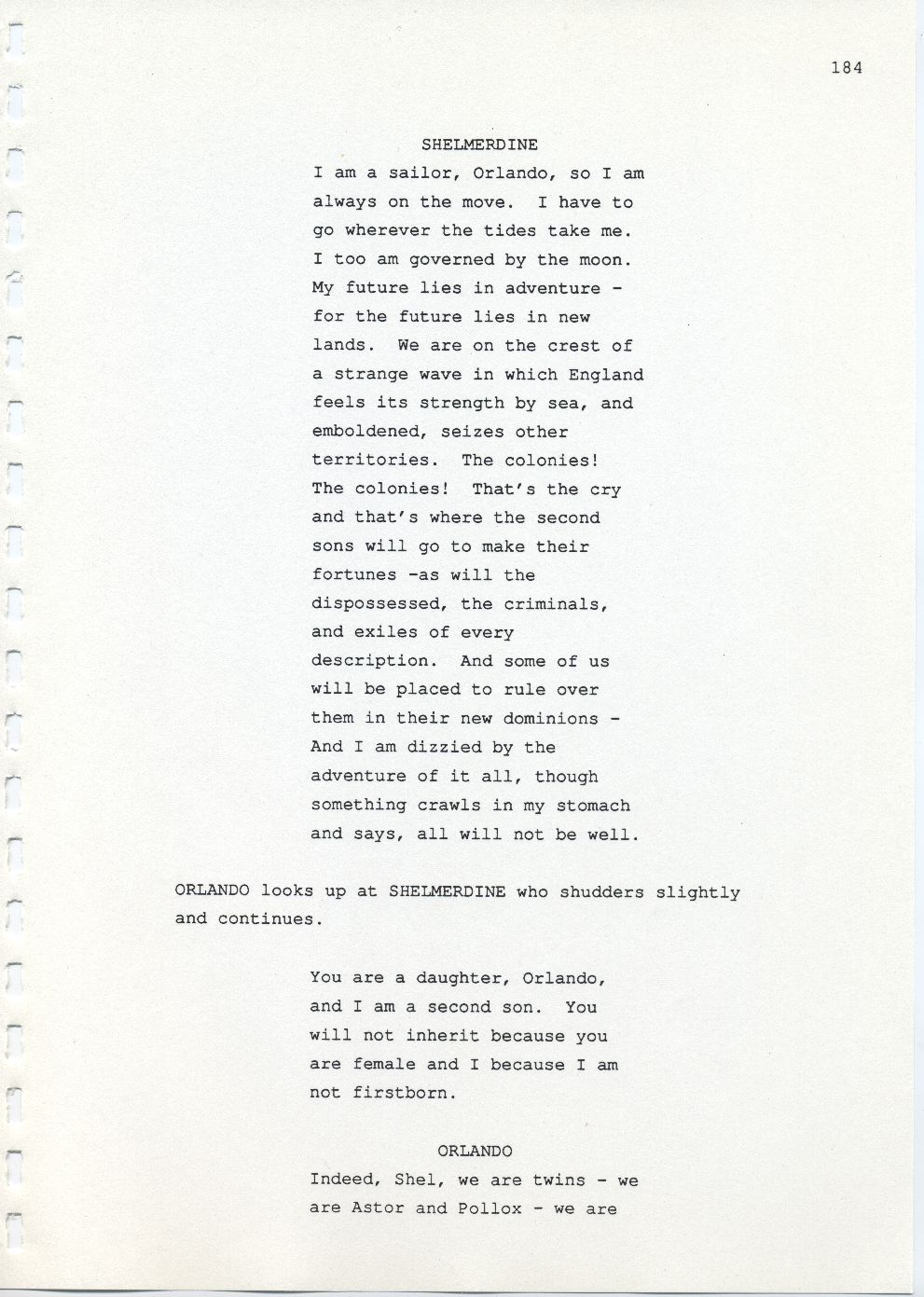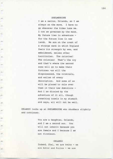 Description Page 184 of revised draft script for Orlando. Black printed text on A4 paper bound with a plastic comb spine