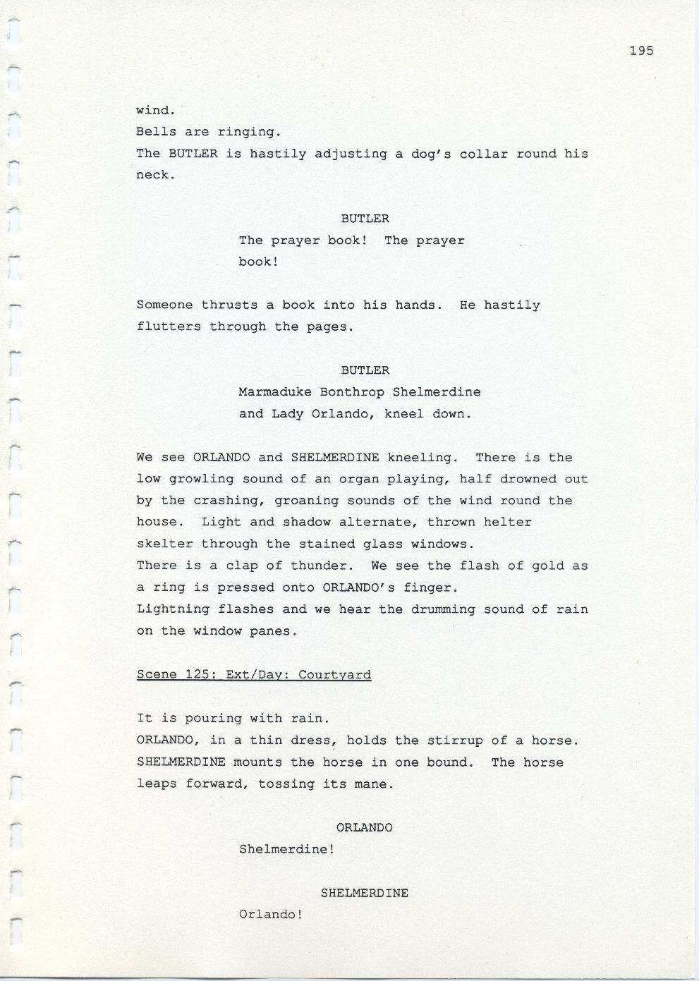Description Page 195 of revised draft script for Orlando. Black printed text on A4 paper bound with a plastic comb spine