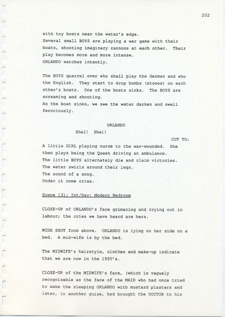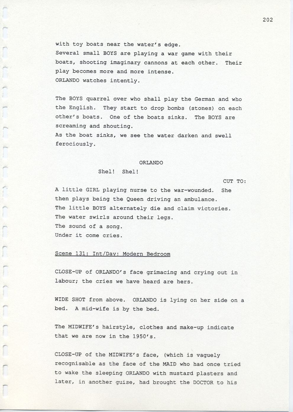 Description Page 202 of revised draft script for Orlando. Black printed text on A4 paper bound with a plastic comb spine