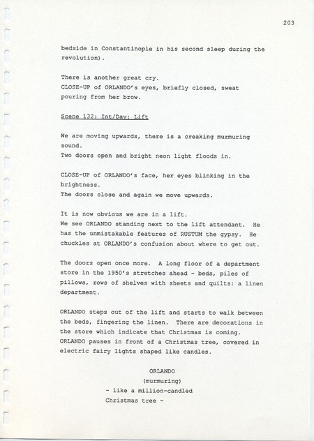 Description Page 203 of revised draft script for Orlando. Black printed text on A4 paper bound with a plastic comb spine