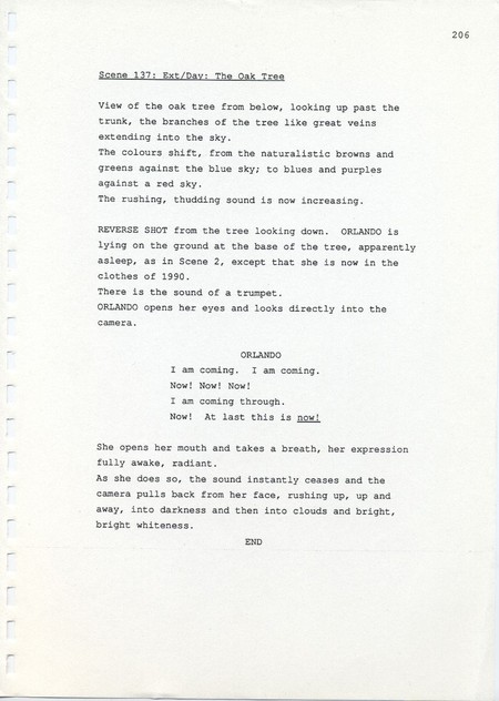 Description Page 206 of revised draft script for Orlando. Black printed text on A4 paper bound with a plastic comb spine